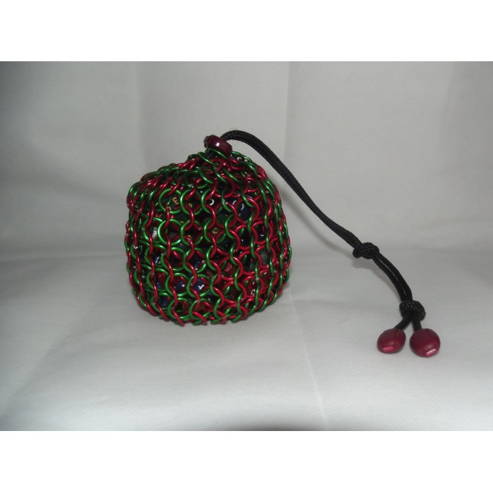 Aluminium butted chain with a paracord draw string opening and a stopper lock to keep it closed. The ends of the paracord have covers to help prevent fraying over time